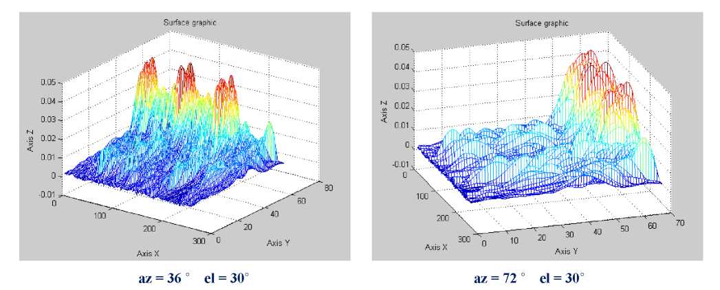 Восстановление параметров двумерных стохастических зависимостей в конечном итоге требует высококачественной визуализации графических фигур. Так, 3D-график «двумерной» плотности распределения удобно рассматривать в полярной системе координат. Рис. 4 показывает p(X,Y) в режиме поворота, что повышает наглядность деталей в распределениях структуры, имеющих полимодальный характер, различный по направлениям X и Y.