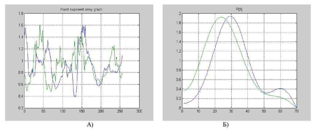 Fig. 5. А) Hurst coefficients H of membrane pore depths along the X and Y axes (blue and green colors, respectively). Б) Reconstructed one-dimensional density functions for H