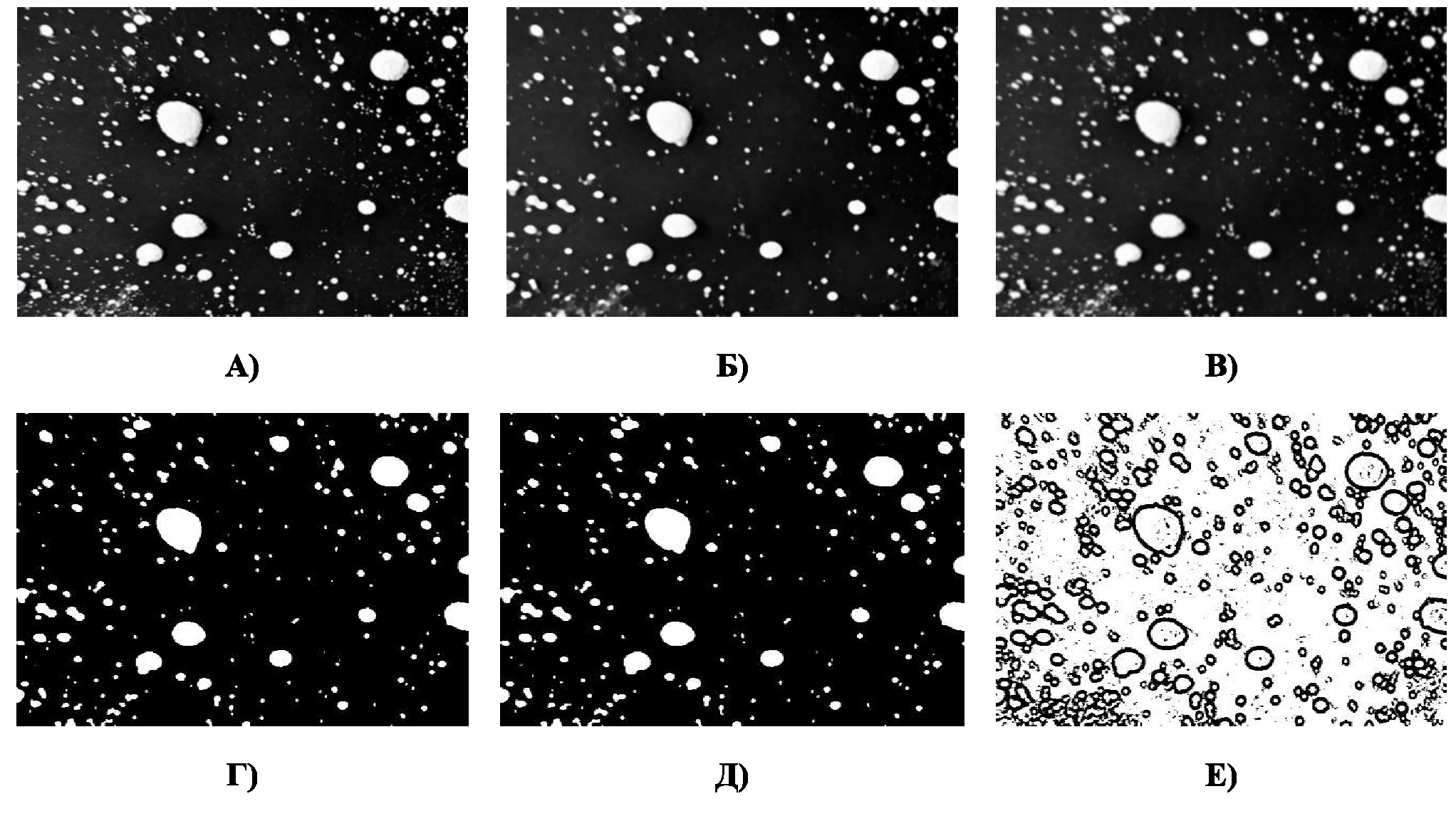 Fig. 3. A) Original image. Б) Result of preprocessing the original image using median filtering. В) Result of applying the Gaussian blur. Г) Result of fixed threshold segmentation. Д) Result of applying Otsu's method for image segmentation. Е) Result of adaptive threshold segmentation