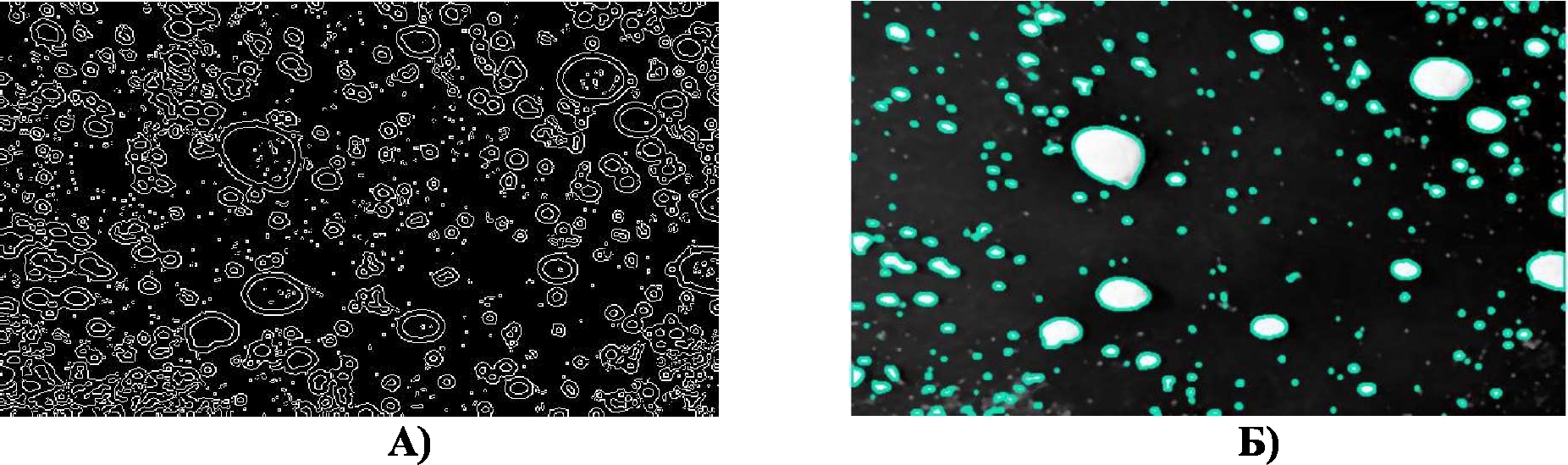 Fig. 4. A) Contours detection using the Canny edge detector. Б) Image with detected defect contours