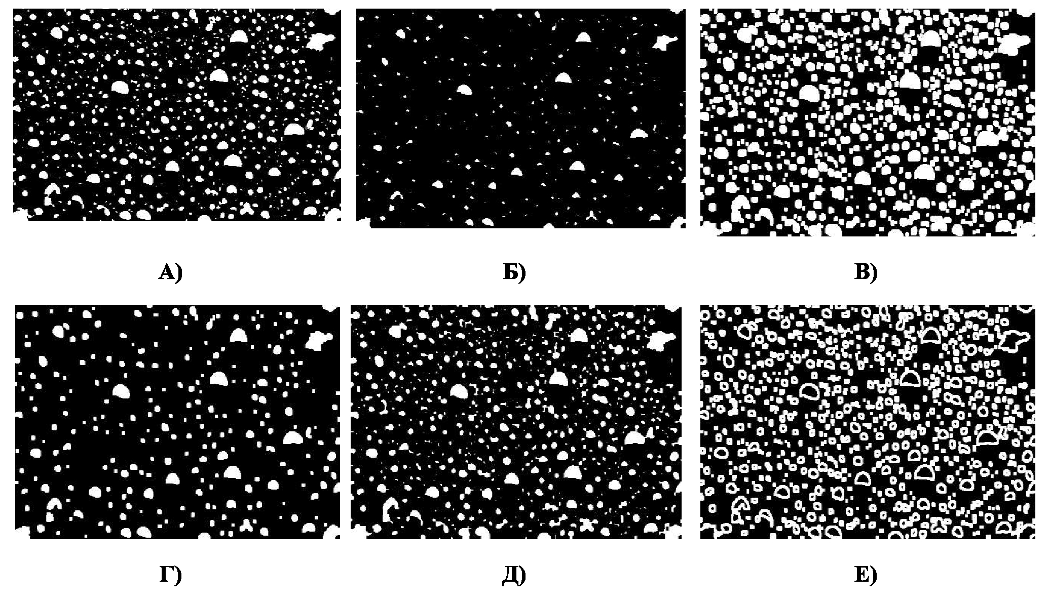 Рис. 6. А) Результат операции бинаризации. Б) Результат операции эрозии. В) Результат операции дилатации. Г) Результат операции открытия. Д) Результат операции замыкания. Е) Результат применения морфологического градиента