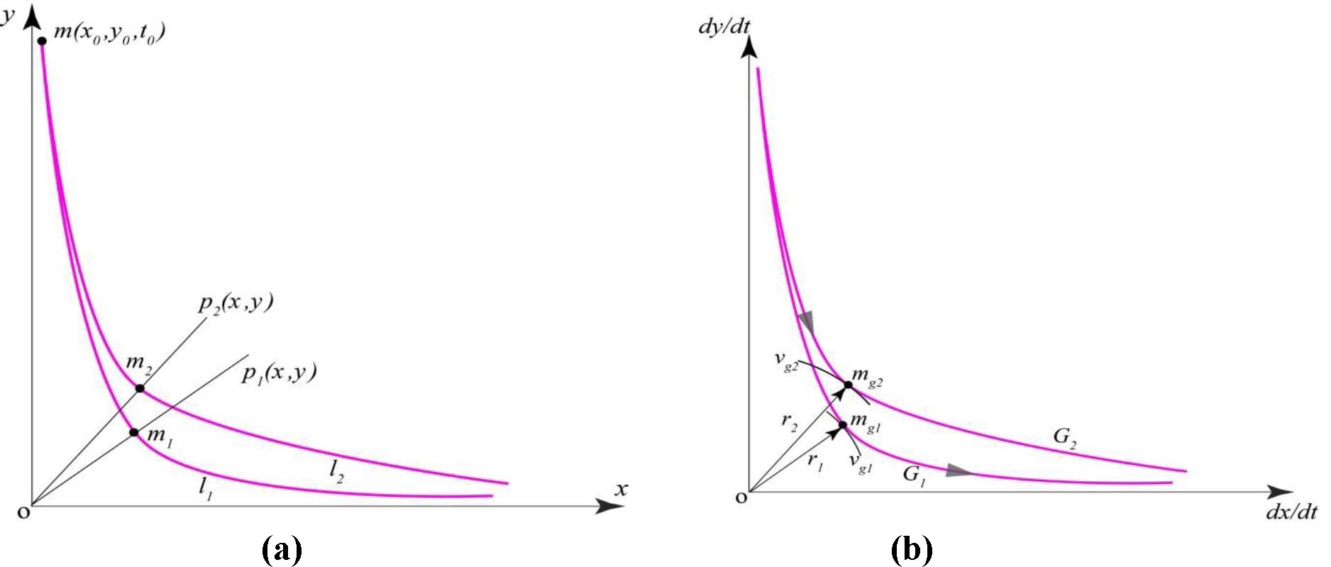 Годограф фазовой скорости G получается путем непрерывного отображения l на плоскость . Также верно, что существует непрерывное отображение для множества на плоскость xOy. Таким образом, если на G найдутся точки условного экстремума (общие для G и V), то эти точки будут отражены на l, т.е. существует непрерывное отображение . Пары , которые содержат координаты mi и ее скорости , могут быть использованы для описания изменения состояния динамической системы. Достаточность такого описания определяется тем, что пары на фазовой траектории образуют геометрическое место точек, фазовая скорость которых принимает экстремальные значения. Множество, сформированное парами , задает закон изменения состояний вдоль траектории.