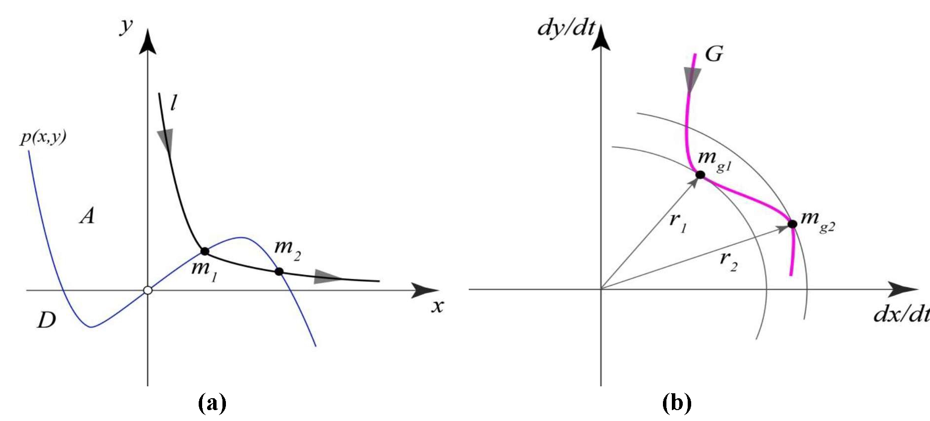 На фазовой плоскости экстремумы фазовой скорости будут расположены на прямых, задаваемых уравнением или (рис. 5). Прямые ‒ границы областей ускоренного (A) и замедленного (D) движений изображающей точки. Точка пересечения фазовой траектории (рис. 5a: т. m1 ) с p(x, y) ‒ условный экстремум. Критические точки можно найти аналитически, как общие точки интегральной кривой и p(x, y):
