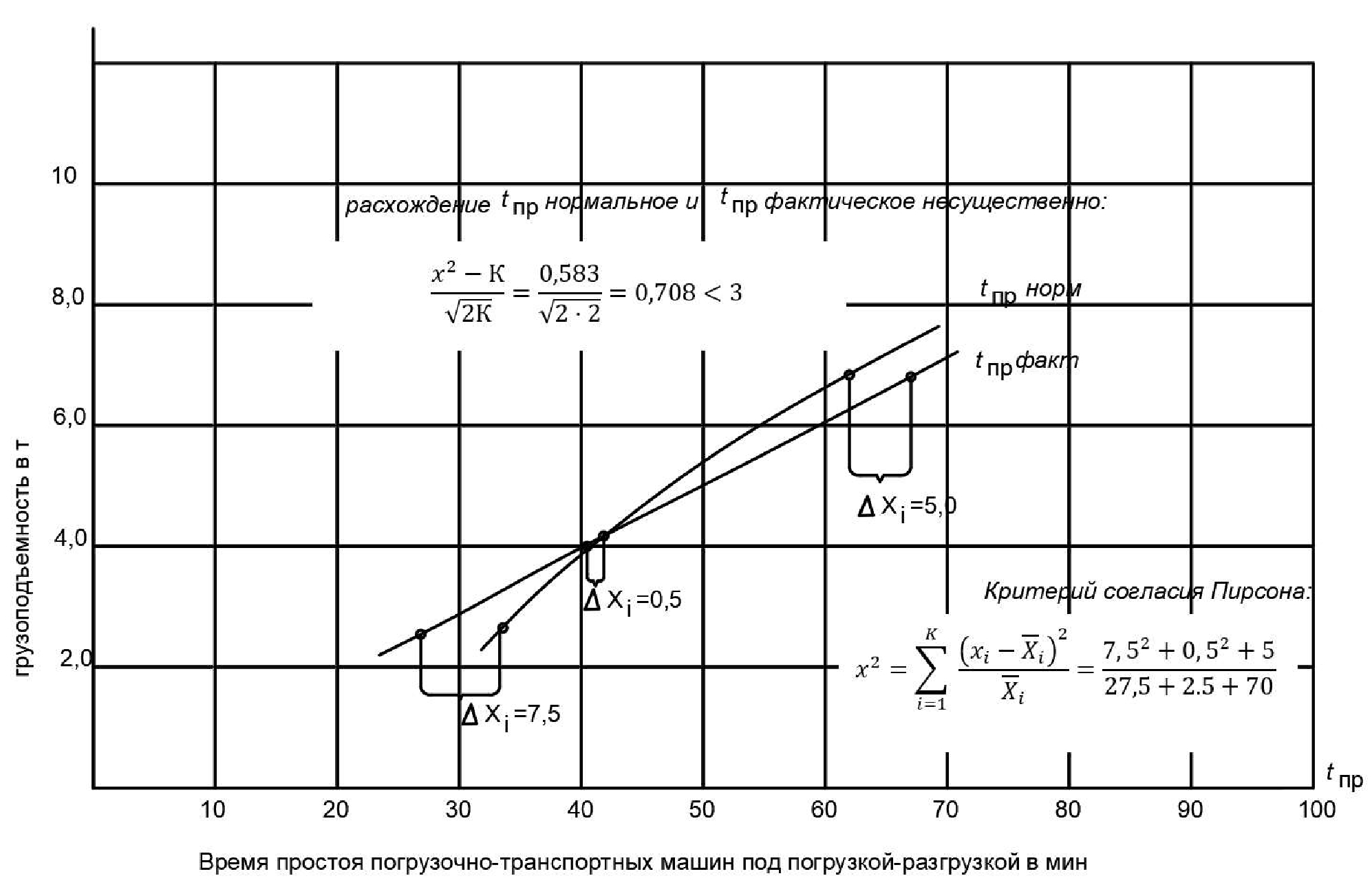 Данные хронометража, полученные по фактическому времени простоя ПТМ под погрузочно-разгрузочными операциями и обработанные в соответствии с «Методикой статистической обработки эмпирических данных» (ГОСТ-РТМ 44-62), подчиняются нормальному закону распределения Гауса [18-24]. Сопоставив нормативные и хронометражные данные времени простоя под погрузочно-разгрузочными операциями (рис. 7), убеждаемся, что в отдельных случаях имеются небольшие отклонения, но относительная погрешность полученных результатов не превышает 9 %, т.е. находится в допустимых пределах.
