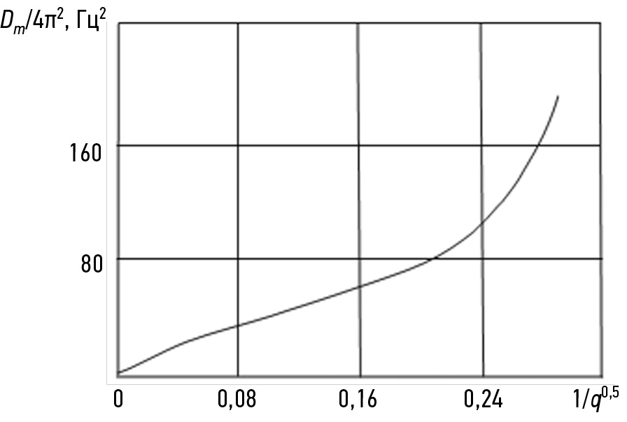 Рис. 3. Зависимость Dm/4π2 от величины f (1/q0,5).