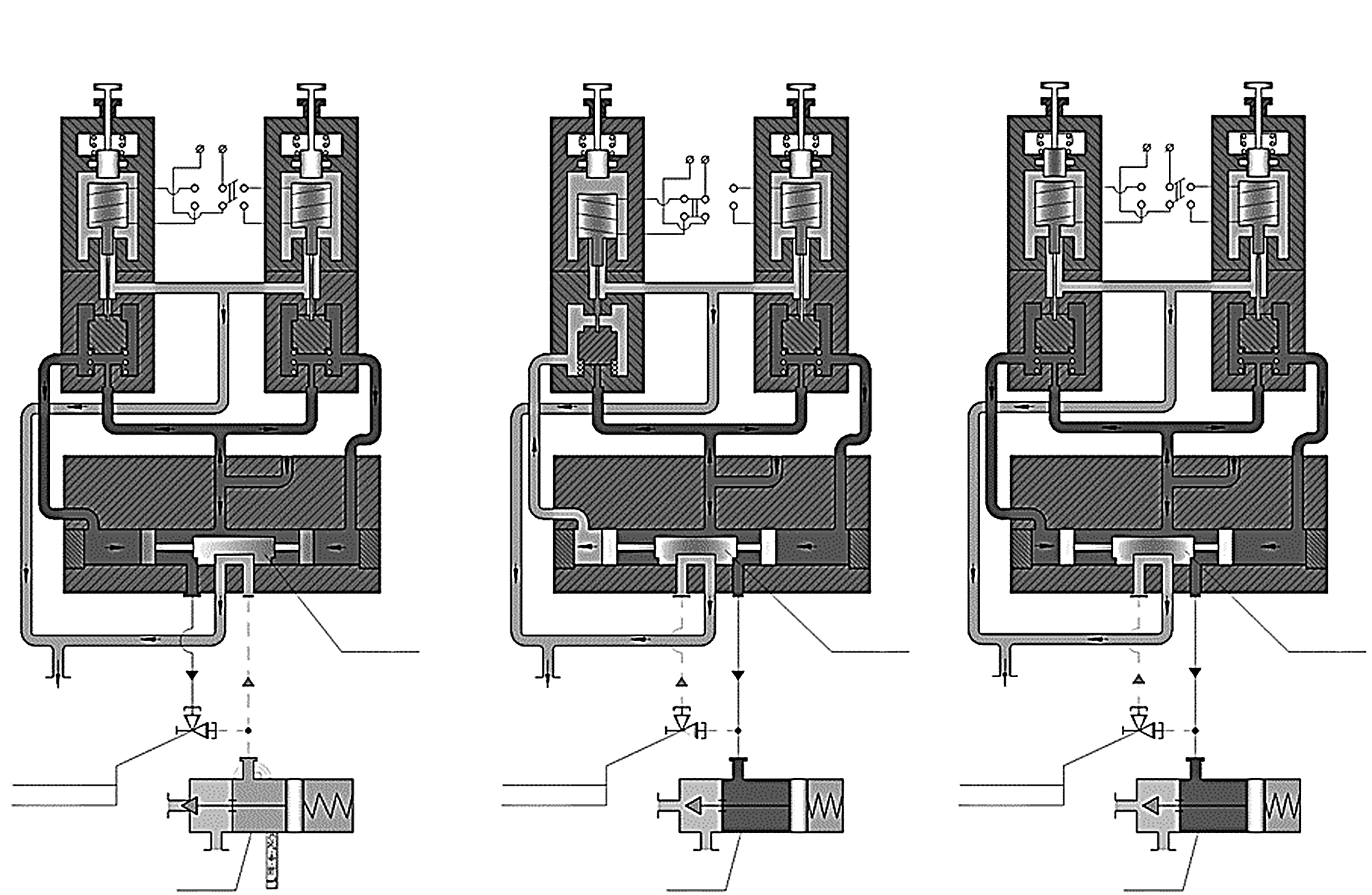 При обесточенной катушке под давлением пружины золотник 1 находится в верхнем крайнем положении. При подаче давления в штуцер «П» воздух перемещает золотник 2 в правое крайнее положение и далее поступает через штуцер «1» в пневмопривод. Одновременно воздух поступает на поршень, который перемещает золотник 3 в левое крайнее положение. Золотник 3 перекрывает проход воздуха в пневмопривод через штуцер «2».