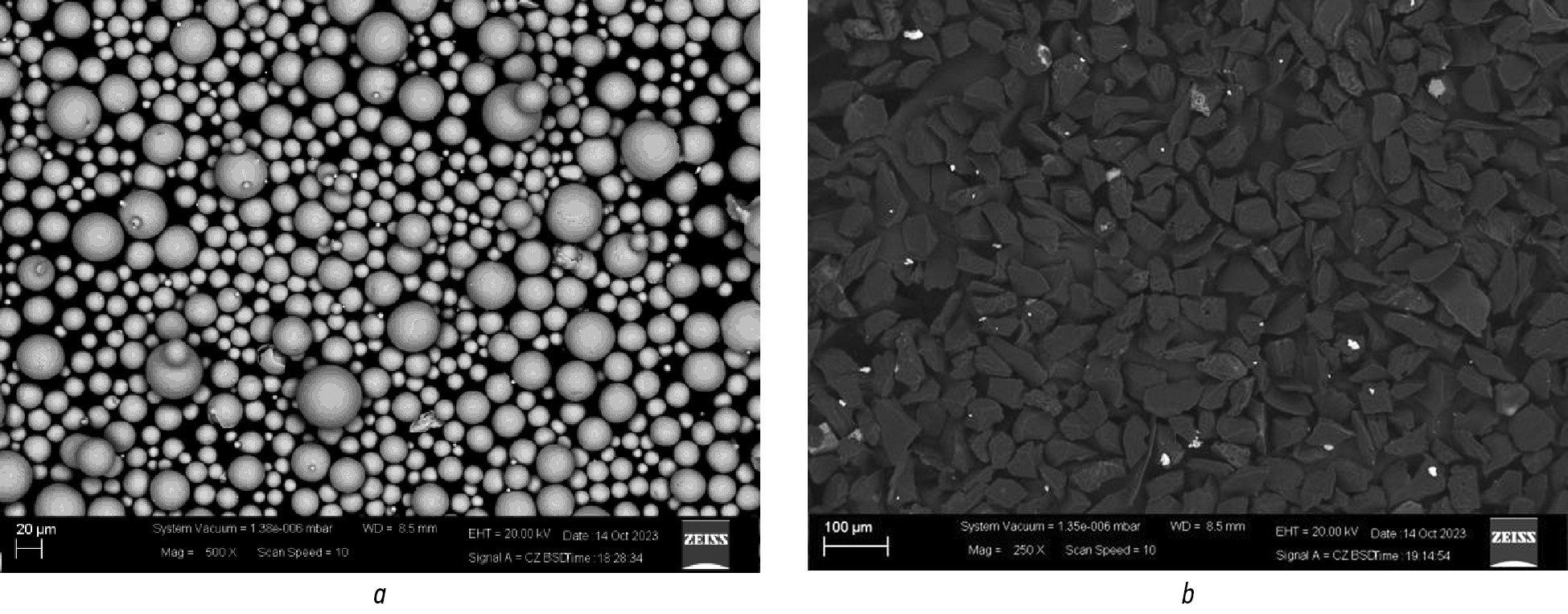 Рис. 1. Изображения компонентов порошковой смеси, полученные на электронном микроскопе: a ― сферический порошок ВТ-6; b ― керамические частицы B4C.