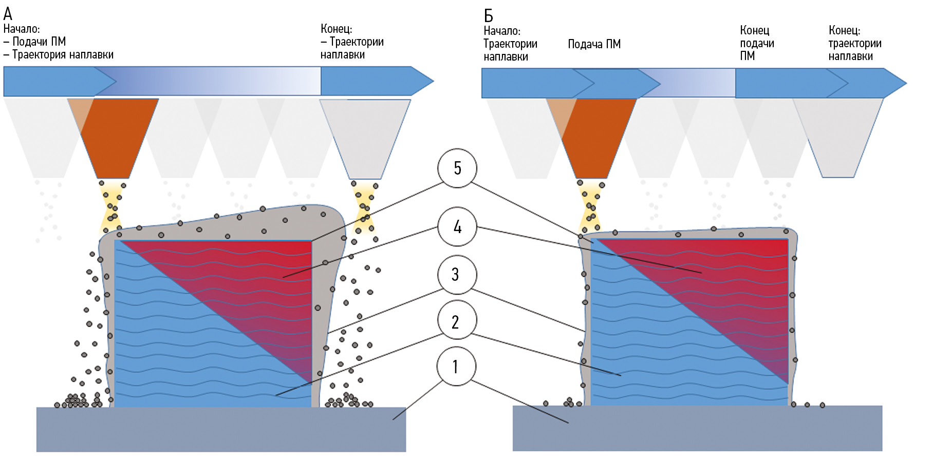 Рис. 2. Подача порошкового материала в процессе лазерной наплавки: А ― непрерывная; Б ― дифференцированная (безынерционная) подача порошка в процессе лазерной наплавки, где 1 ― обрабатываемая (подогреваемая) подложка, 2 ― наплавляемая структура (на горячую подложку), 3 ― материал наплавки, подверженный последующему удалению, 4 ― рост начальной температуры каждого последующего слоя до температуры, вызывающей налипание гранул порошкового материала, 5 ― контур предполагаемой наплавляемой структуры. ПМ ― порошковый материал.