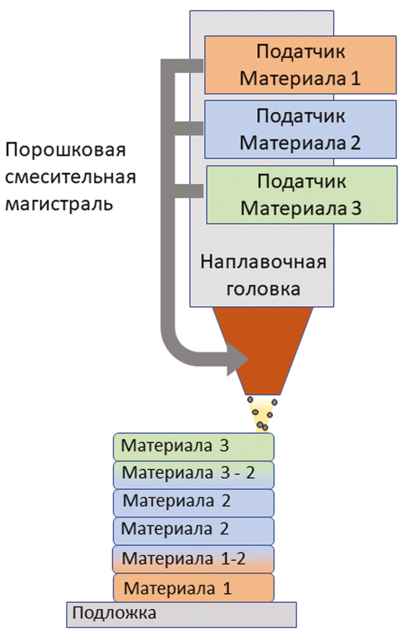 Представленная концепция может быть применима для получения градиентных структур и структур разнородных материалов. Это достигается за счет использования нескольких подающих устройств, порошковые магистрали которых объединяются в сопловой части наплавочной головки, вносящей порошковый материал в зону воздействия лазерного луча. Организация методов комбинации нескольких устройств подачи порошковых материалов в одном технологическом процессе требует наличия в информационной системе алгоритмов: взаимодействия систем подачи; отношения их смешивания; совокупного влияния газовых потоков, инерционной составляющей системы перемещения подачи; контроля тепловых и гидродинамических процессов, протекающих непосредственно в зоне наплавки.