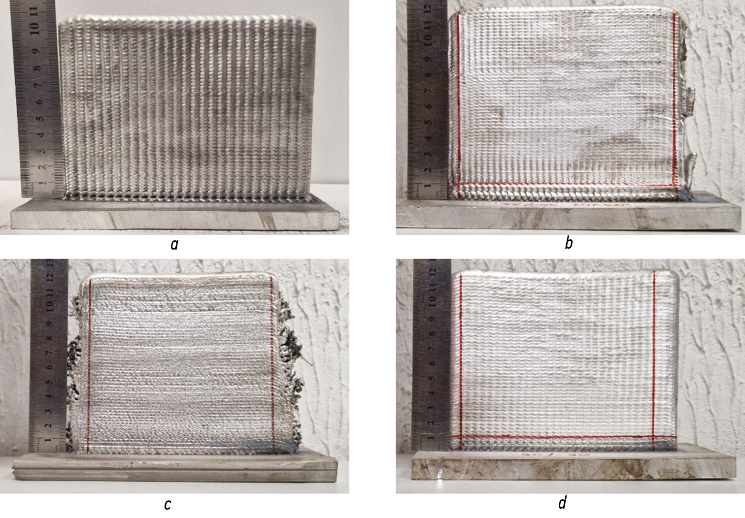 Рис. 3. Внешний вид полученных образцов: a ― линейные колебания перпендикулярно направлению выращивания; b ― линейные колебания под углом 45 градусов относительно направления выращивания; c ― эллиптические колебания вдоль направления выращивания; d ― змейка.