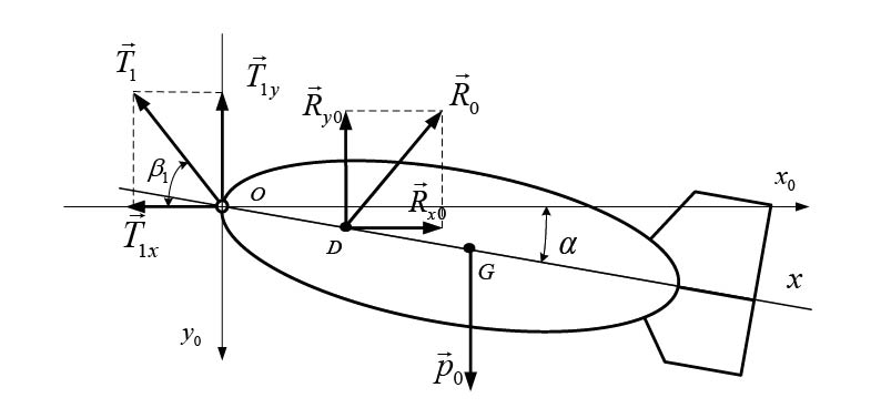 где cx(α), cy(α) — коэффициенты сопротивления и подъемной силы (они для заданного ПО определяются экспериментально как функции угла атаки α); b=OG — расстояние до центра приложения силы гидродинамического давления; a=OD — расстояние до центра тяжести, d — характерный размер ПО, p0 — его отрицательная плавучесть.