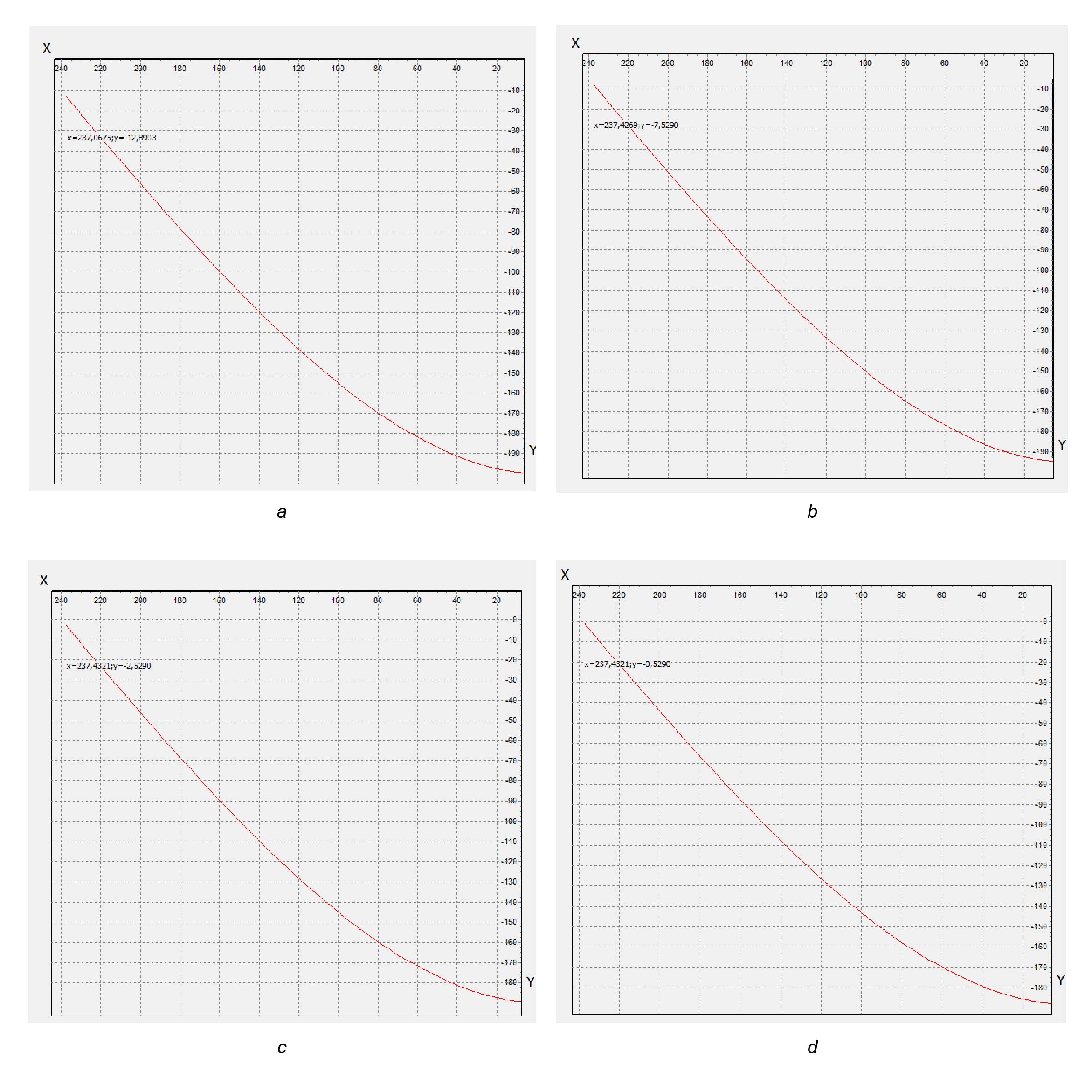 Рис. 4. Конфигурация кабель-троса при постоянных скоростях буксировки и течения. a — расчет с начальной глубиной Y0=200 до поверхности 12,89 м, b — расчет с начальной глубиной Y0=195 до поверхности 7,53 м, c — расчет с начальной глубиной Y0=190 до поверхности 2,53 м, d — расчет с начальной глубиной Y0=188 до поверхности 0,52 м.