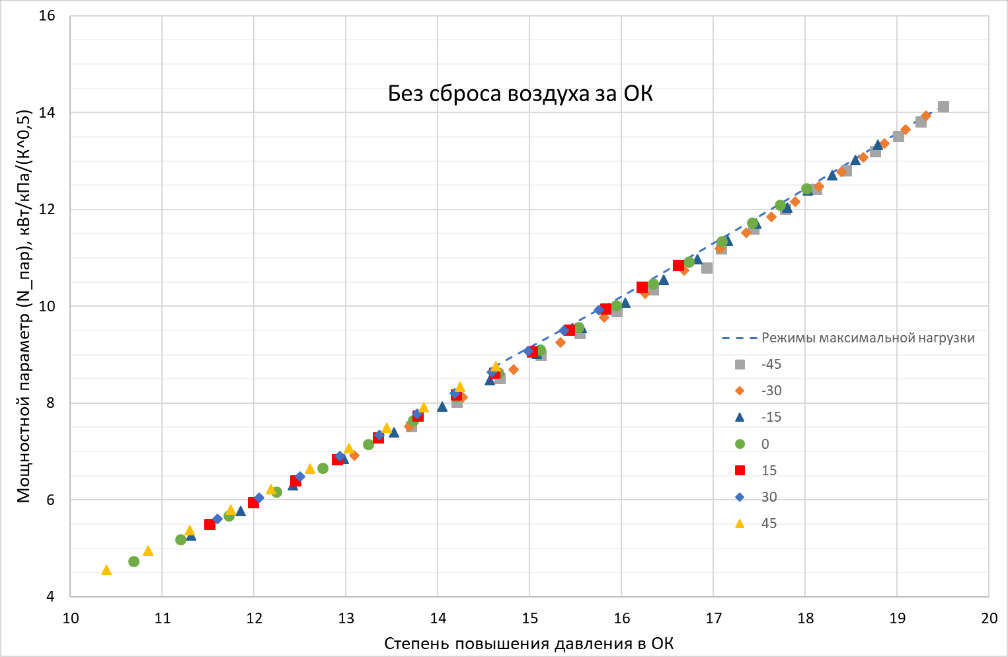 Как видно из рис. 6, несмотря на сильные отличия рассмотренных режимов (изменение режима работы, изменение КПД осевого компрессора), зависимость мощностного параметра от степени повышения давления в ОК для этих режимов с высокой точностью ложится на одну линию.
