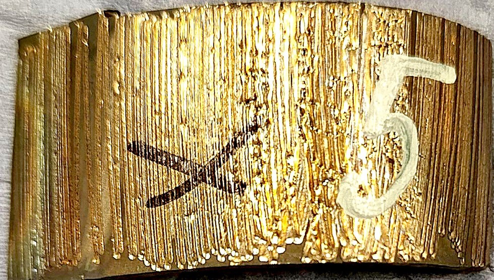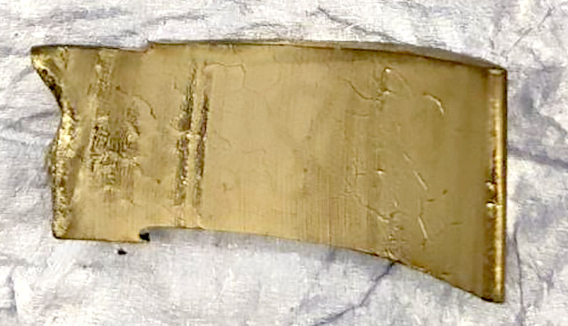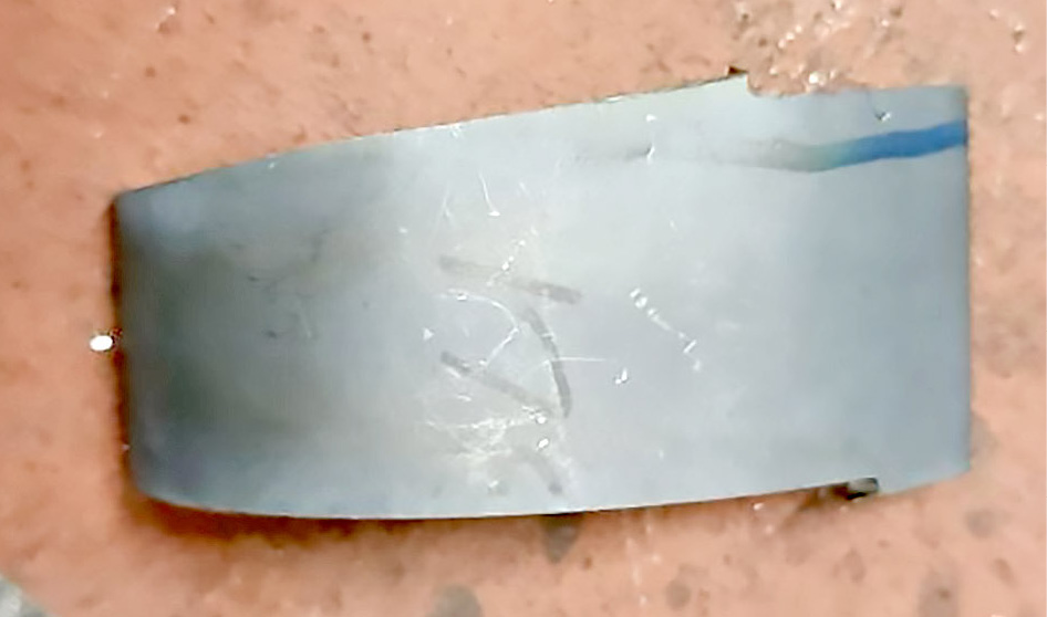На рис. 7 представлена фотография образца, на котором заметны повреждения от обработки: трещины и проплавления. У данного образца множество трещин и проплавлений, что обусловлено мощностью, на которой проводилась чистка, а именно 2000 Вт. Повреждения по краям, в отличие от середины, объясняются более тонким слоем материала.