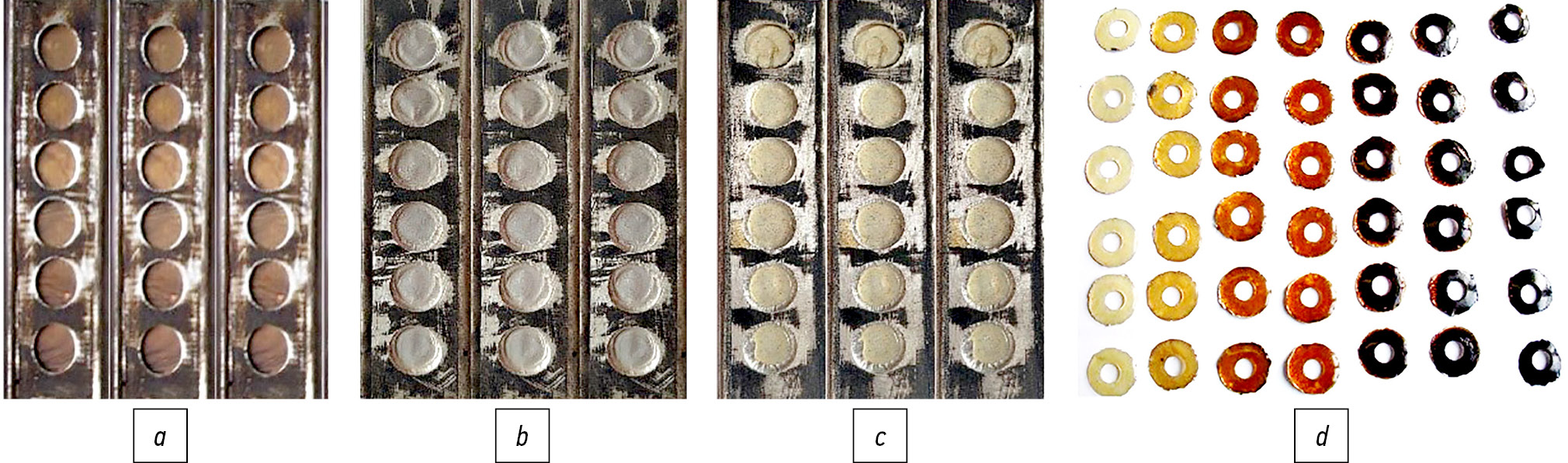 Рис. 1. Структурная единица — устройство для объединения образцов: a — устройство с медной пластиной; b — устройство с медной пластиной и алюминиевой фольгой; c — устройство с оплавленным полимером; d — образцы после испытаний.