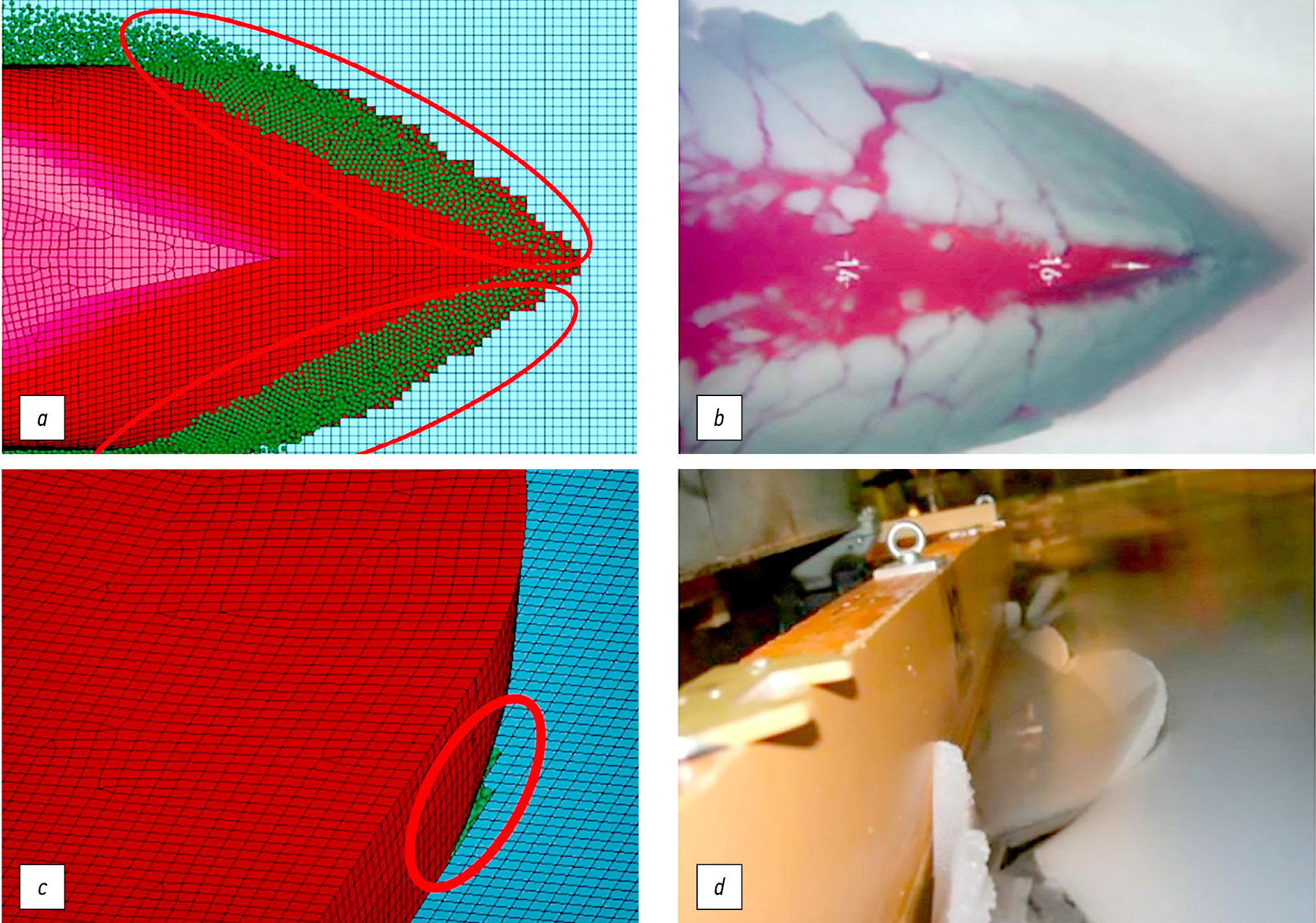 Fig. 1. Accumulation of ice debris in the bow and lateral parts of an icebreaker when interacting with solid ice [17]: a, c, numerical modeling; b, d, experiment.