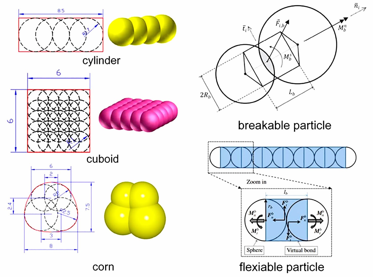 Помимо численного учета потока при исследовании ледопроходимости существует и эмпирический, используемый совместно с DEM. Результаты [38] показывают, что ледовое сопротивление мало изменяется при изменении размера льдины, что противоречит выводам [28]. Различные формы льдин рассмотрены в [39], сферические частицы — [40]. Моделирование ледяной крошки с помощью тетраэдрических и неправильных многогранных частиц, которые представляют собой составные частицы, состоящие из нескольких основных сферических частиц [41] (рис. 8). По результатам наблюдается соответствие данных моделирования модельному испытанию по среднему сопротивлению.