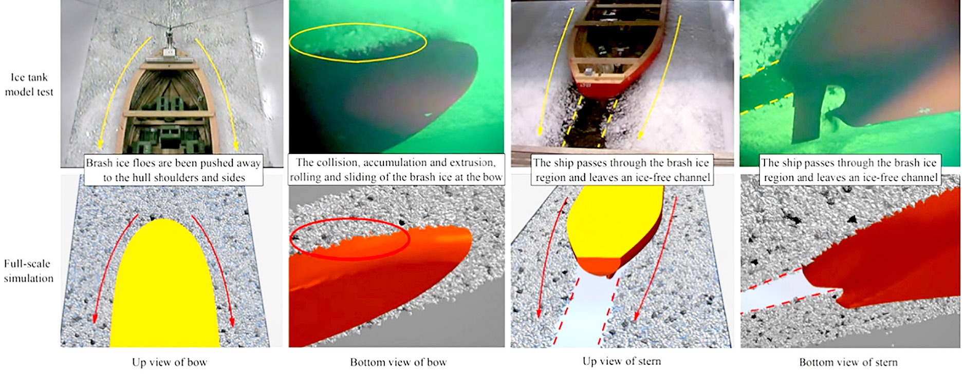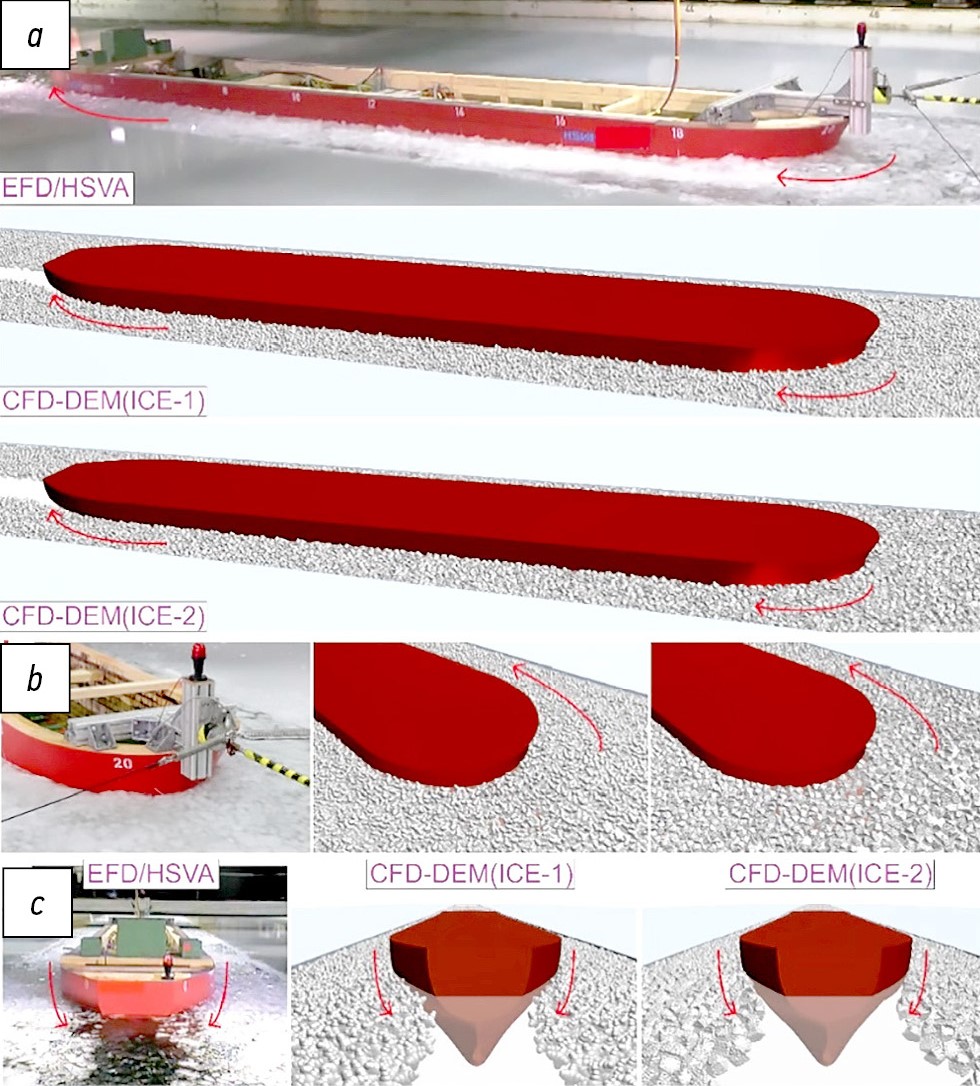 В [35] строится вычислительная модель для имитации движения судна в предварительно проложенном ледоколом ледовом канале. Модель применяет вычислительную гидродинамику для расчета обтекания движущегося судна в сочетании с усовершенствованным методом дискретных элементов для моделирования предварительно разрушенных кусков льда. Эксперименты в масштабе модели также были проведены в ледовом бассейне Aalto Ice Tank для проверки моделирования, которое показывает, что вычислительная модель может дать разумную оценку сопротивления предварительно разрушенного льда и движения вокруг судна. При валидации была проанализирована зависимость ледового сопротивления от скорости судна. Моделирование позволяет осуществлять подводный мониторинг движения льда, указывая на то, что скорость судна зависит от массы льда, погруженного под него и от вызванного корпусом смещения битого льда. Выявленные зависимости являются более сложными, чем широко используемое предположение о том, что ледовое сопротивление линейно изменяется со скоростью судна во всех случаях, что обеспечивает более глубокое понимание ледового сопротивления.