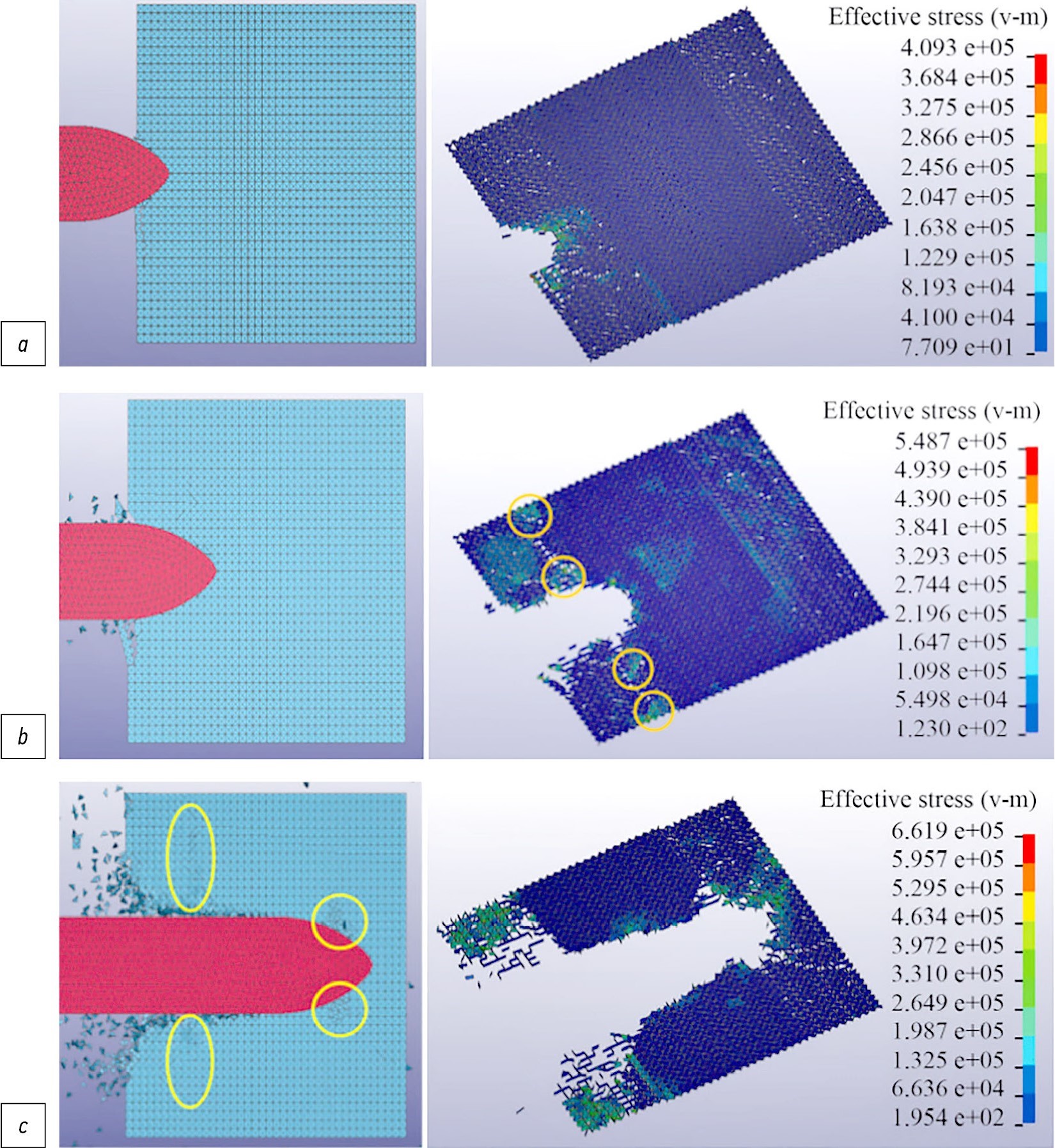 Fig. 3. Comparison of ice damage between model tests [24]: a, b, experiment; c, numerical modeling.