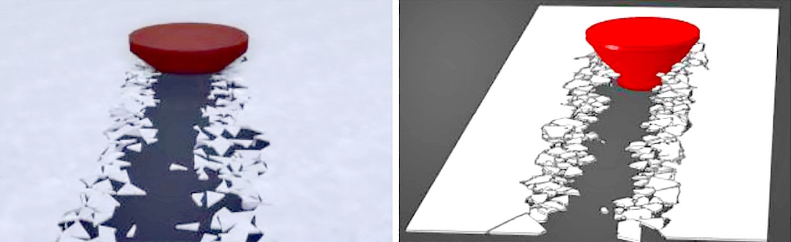 В численном моделировании большой проблемой является создание хрупкого сплошного льда на свободной поверхности (рис. 3). В [24] авторы частично решают эту проблему с использованием одностороннего сопряжения метода вычислительной гидродинамики и дискретных элементов. Наблюдается процесс распространения радиальных и кольцевых ледяных трещин.