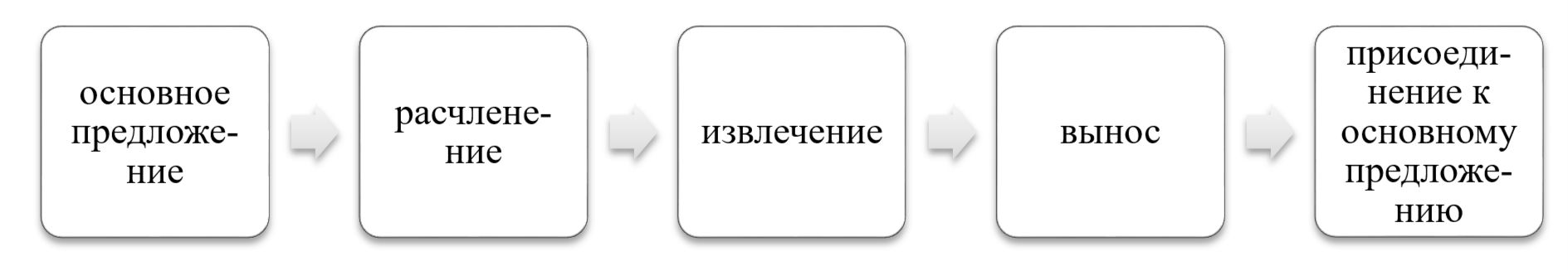 На первом этапе от исходного (основного, базового) предложения отсекают структурно-семантическую часть, выраженную словом, словосочетанием или предложением, то есть происходит расчленение исходного предложения на две части. Разделение проходит по границе между слабоуправляемыми членами предложения или между предикативными частями сложного предложения. На втором этапе отчлененную часть извлекают из исходного предложения, то есть происходит процесс выделения какой-то части. На третьем – отделенную часть выносят за пределы исходного предложения, располагают после точки. И, наконец, на четвертом, завершающем этапе вынесенную часть присоединяют к усеченному исходному предложению, то есть происходит процесс присоединения отчлененной части к основному предложению.