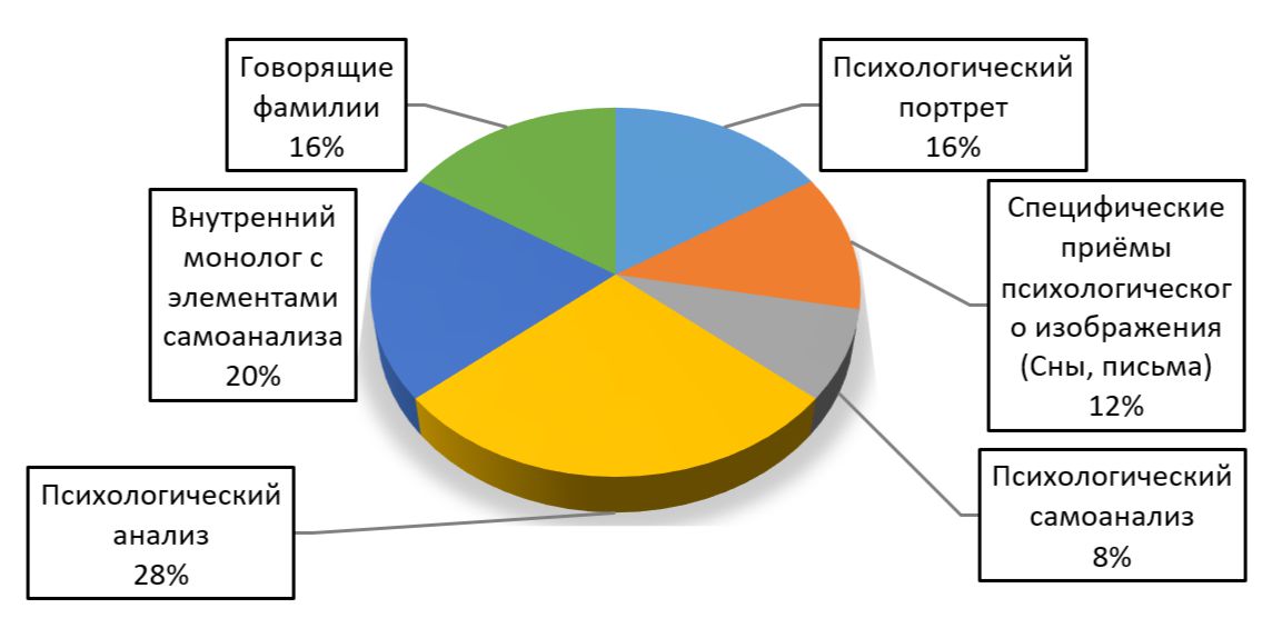 Если говорить о средствах и приемах психологического изображения, можно заключить, что при помощи психологического анализа (28%), который используется Прилепиным чаще всего, автор показывает героев со стороны, что они хотят любить, дружить, быть счастливыми, но, к сожалению, счастья не обретают. Внутренний монолог с элементами самоанализа (20%) дополняет эмоциональную составляющую, показывая, что героев одолевают мысли о том, правильно ли они поступают, и можно ли было поступить иначе. Автор использует психологический портрет (16%) с целью описать состояние, в котором пребывают герои в данный момент. Можно констатировать наличие «говорящих фамилий» (16%), что довольно характерно для реализма в целом и для нового реализма в частности. Сны, бредовые видения, письма (12%) играют немаловажную роль в раскрытии внутренних переживаний героев: во сне персонаж пытается уйти от проблем, но у него это не получается; в письмах пытается найти ответы на свои вопросы, разобраться в семейных проблемах. Психологический самоанализ (8%) также помогает читателю понять образ героев, их душу. Они пытаются переосмыслить то, что с ними происходит, и приходят к выводу, что одиноки (см. Диаграмму 2).