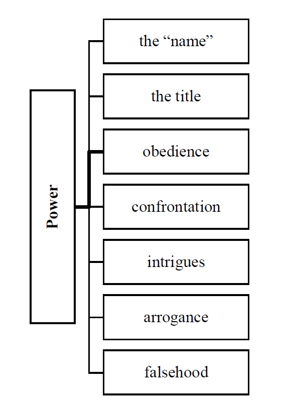 Трагедия У. Шекспира «Король Лир» одна из наиболее четких и однозначных трагедий в плане выраженных в ней концептов. Фреймы концепта «power» в основном представлены здесь в едином русле, хоть и нередки случаи, когда, казалось бы, положительное явление трактуется с негативной стороны, дополняя отрицательную репрезентацию концепта. Такой прием, конечно, нередок как в литературе в целом, так и в других творениях автора, но именно в данной трагедии эти иллюзии и обманы заставляют читателя сопереживать главному герою и одному из его дочерей. Изучив дефиниции лексемы power, а также текст трагедии У. Шекспира, представим структуру концепта “power” в схеме, представленной на рисунке.