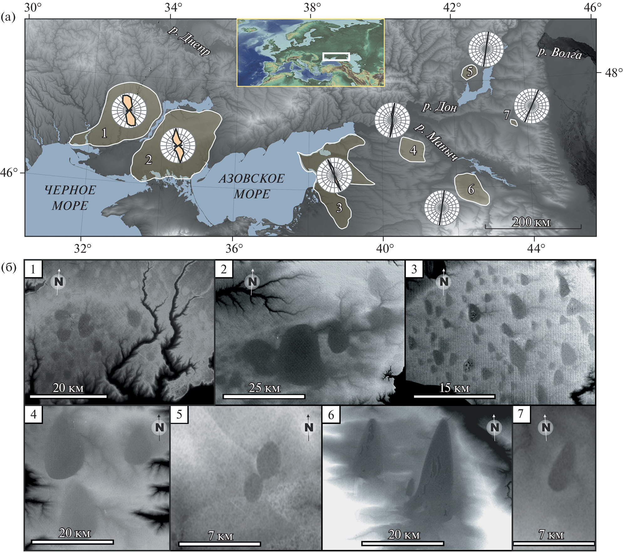 На основе цифровой модели рельефа SRTM произведен анализ морфометрических характеристик крупных замкнутых депрессий (крупных западин) проблематичного генезиса, распространенных на лёссовых междуречьях Северного Причерноморья, Приазовья, Западного Предкавказья и бассейна Нижнего Дона. Нами было зарегистрировано 312 таких форм. Установлено, что площадь западин изменяется от 0.4 до 216 км2, глубина от 1 до 21 м, ширина от 0.5 до 13.3 км, длина от 0.7 до 27.5 км, коэффициент удлиненности от 1 до 4, высота от 3.3 до 103.3 м над у. м. Наиболее часто встречаемые западины имеют следующие параметры: площадь – 2–4 км2; глубина – 2–3 м; ширина – 1.0–1.5 км; длина – 2.5–3.0 км; коэффициент удлиненности – 1.2–1.4; высота 15–20 м абс. Обнаружена корреляция между площадью и глубиной западин. Форма западин в основном удлиненная – каплевидная, яйцевидная, эллиптическая, треугольная, редко – круглая. “Острые” концы яйцевидных впадин всегда тяготеют к северному направлению, а “тупые” – к южному. Западины были сгруппированы нами по семи ограниченным ареалам, внутри которых эти формы отличаются небольшой спецификой размеров и морфологических черт. Внутри всех ареалов наблюдается высокая согласованность ориентировки длинных осей западин. Для самых крупных западин Приазовья и Предкавказья характерны продольные гряды, приуроченные к западному борту этих форм. При сравнении ареалов установлено веерообразное изменение направления длинных осей – от СЗ в Северном Причерноморье и Восточном Приазовье до С в Западном Предкавказье и СВ в Центральном Предкавказье. На территориях распространения западин наблюдается радиально-центростремительный рисунок эрозионной сети. Впадающие в западины малые эрозионные формы представлены очень пологими и широкими балками и ложбинами, которые лишены постоянного руслового стока. Такая морфология (отсутствие признаков молодой эрозии) говорит в пользу реликтовой природы эрозионных форм и, как следствие, указывает на доголоценовый возраст самих западин. Геолого-географические особенности распространения крупно-западинного рельефа в совокупности с морфологией западин позволяют предполагать дефляционную природу этого комплекса рельефа.