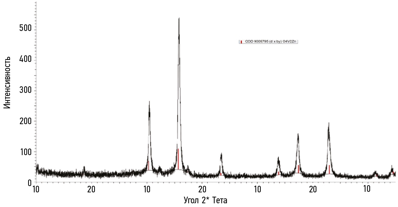 Методы. В данном исследовании был произведен гидротермальный синтез шпинели ZnV2O4, как перспективного катодного материала [7], синтез длился 48 часов в тефлоновом автоклаве. Рентгенограмма полученного вещества представлена на рис. 1.