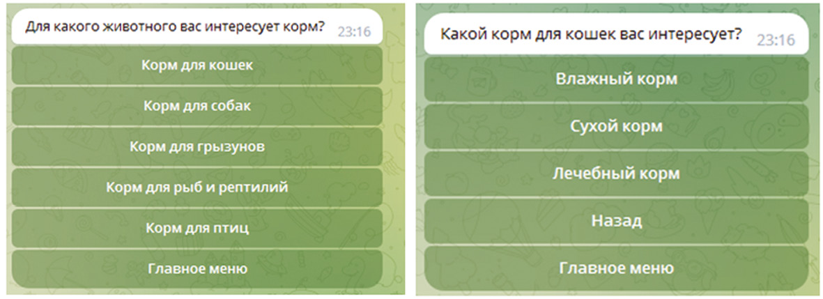 Рис. 2. Меню кнопок «Корм для животных» (слева) и «Корм для кошек» (справа)